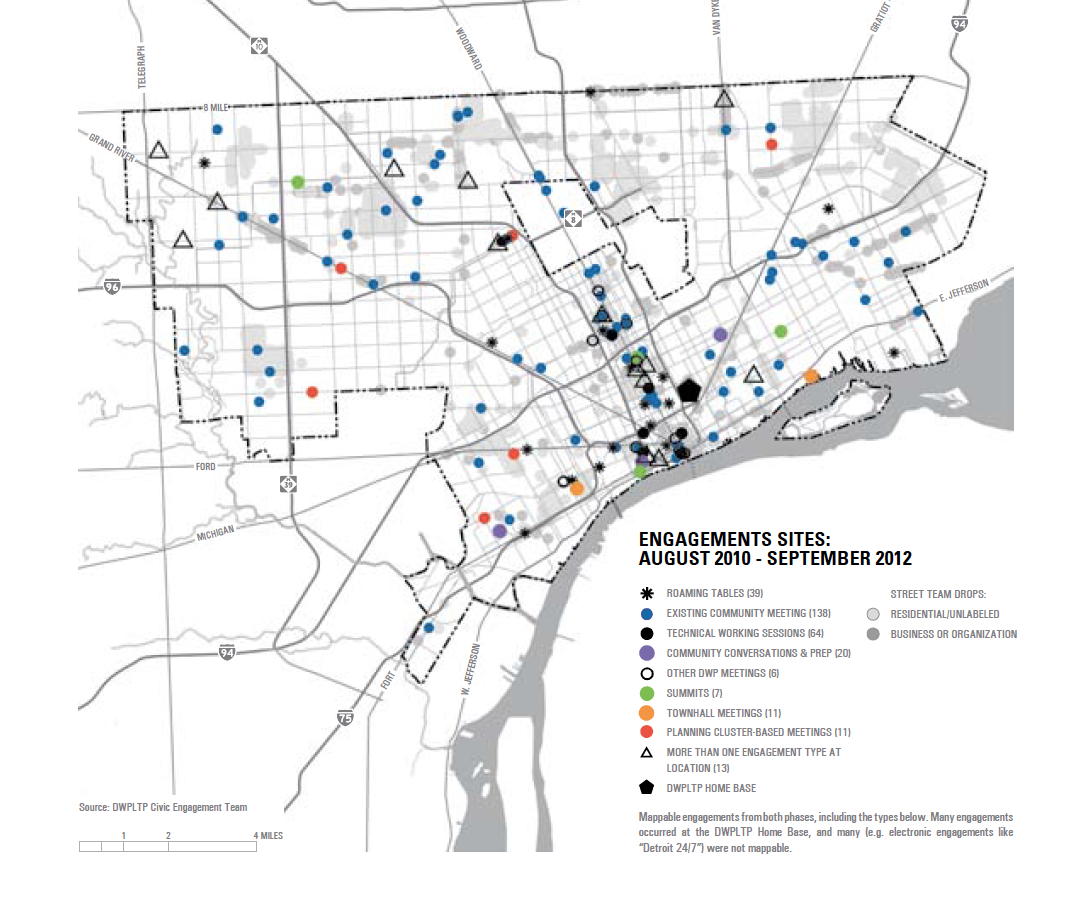This may be one of the most interesting maps within the Detroit Future City reports. This map shows the extent of DFC community engagement. They note that they kept a broad definition of community and worked to engage all potential stakeholders. The map represents Detroit’s infrastructure of people and notable organizations. These are the locations where people are being listened to, where people are organizing their own communities, and where people are beginning to remake their neighborhoods.
