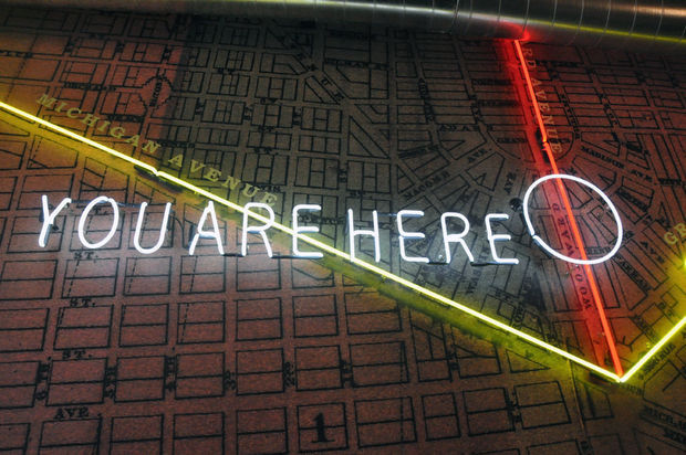 If you’ve been inside the Madison Building lobby, then you couldn’t have missed this map on the wall. There is slight problem with the location of the neon circle. The Madison Building is not off of Woodward as it seems to appear on the map, but rather off of Broadway and closer to Grand Circus Park. Hopefully the yellow neon on Michigan Ave. and Gratiot Ave. represents the next streetcar rail development that Dan Gilbert will fund?