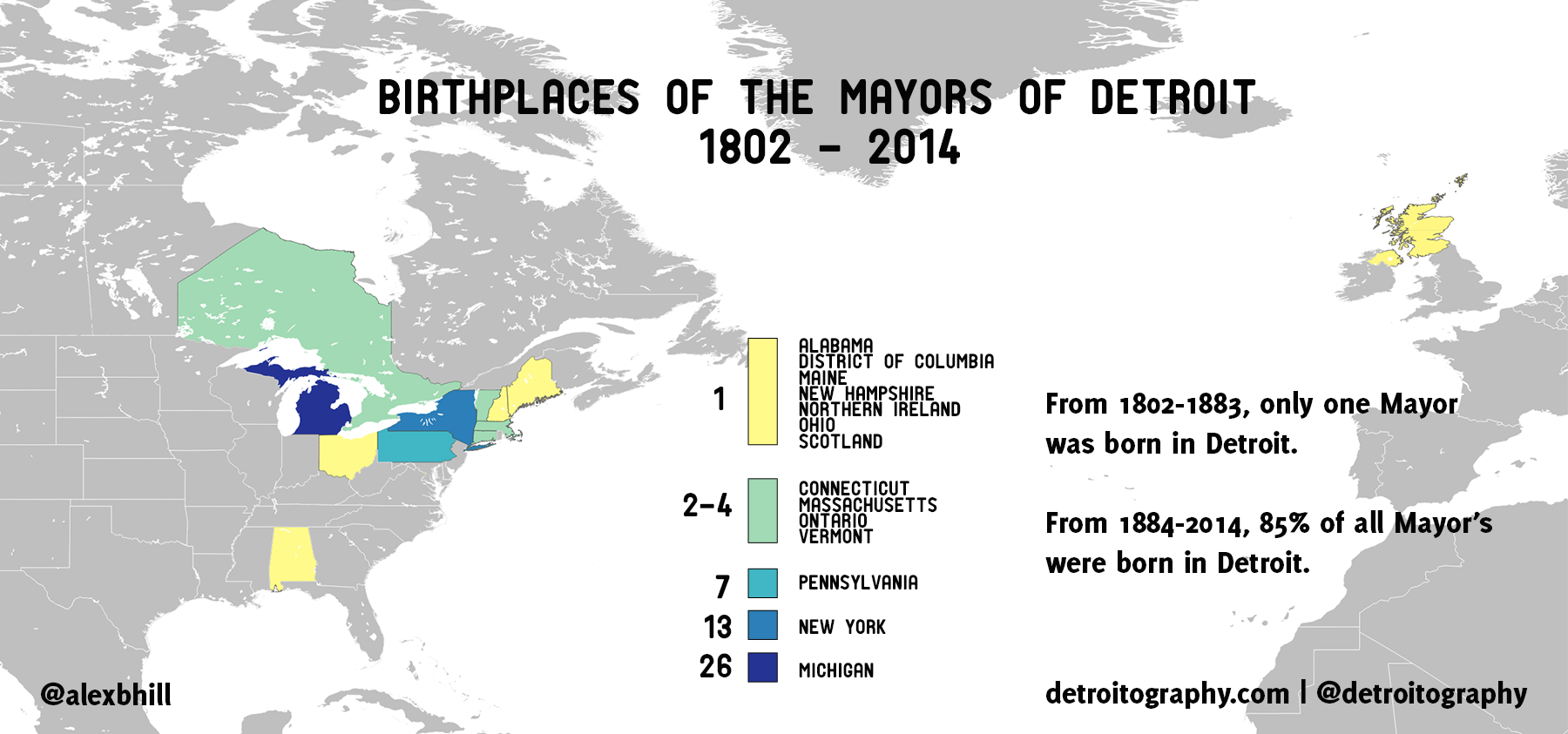 I think Detroit should be a part of the fad and has a very interesting map that reaches across the Atlantic showing Detroit’s days as a “frontier town.” The majority of early Mayors came from states on the East Coast, which is not surprising given the level of immigration moving from the East to the Midwest. Detroit was a main way point as immigrants made their way West to new areas of the United States. Detroit’s proximity to Canada earned it two Mayors born in Ontario. Emblematic of the Great Migration of African Americans from the South starting in 1910, Detroit had one Mayor who was born in the South, Coleman Young. His family moved to Detroit in 1923 and he began working for the Ford Motor Company.