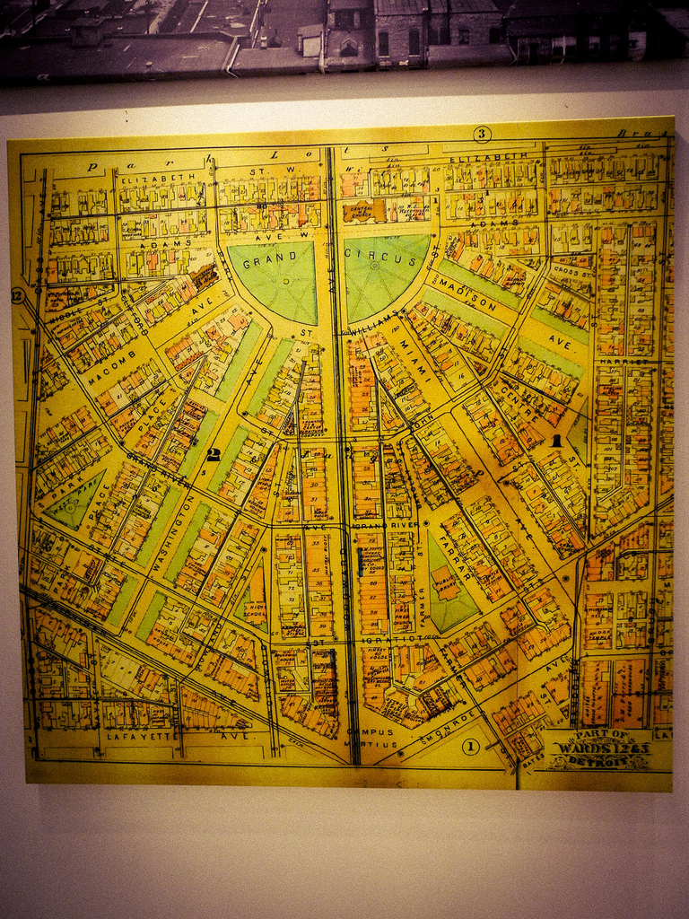 Just a beautiful map of Detroit (Necklace District area) inside the Guardian Building. The bottom corner reads that this is a map of Wards 1,2, & 3. Detroit is no longer broken into wards, which were based on the original ribbon farm boundaries, but recently voted to move to new Districts.