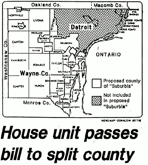 The proposed plan passed in the Michigan House, but was sent to Committee to die. Can you imagine living in Metro Detroit where there was Suburbia County and everything Detroit and East? If anything this is an important representation of the municipal and legislative mentalities that have continued to push for this invisible line drawing.