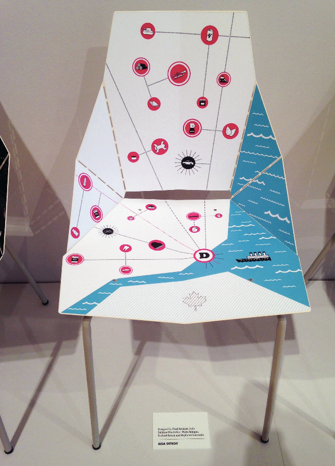 Members of the AIGA Detroit Chapter created a design for the “Facing Forward: AIGA at 100” exhibition in New York. So awesome that they chose a map image design of the Detroit area for their Real Good Chair!