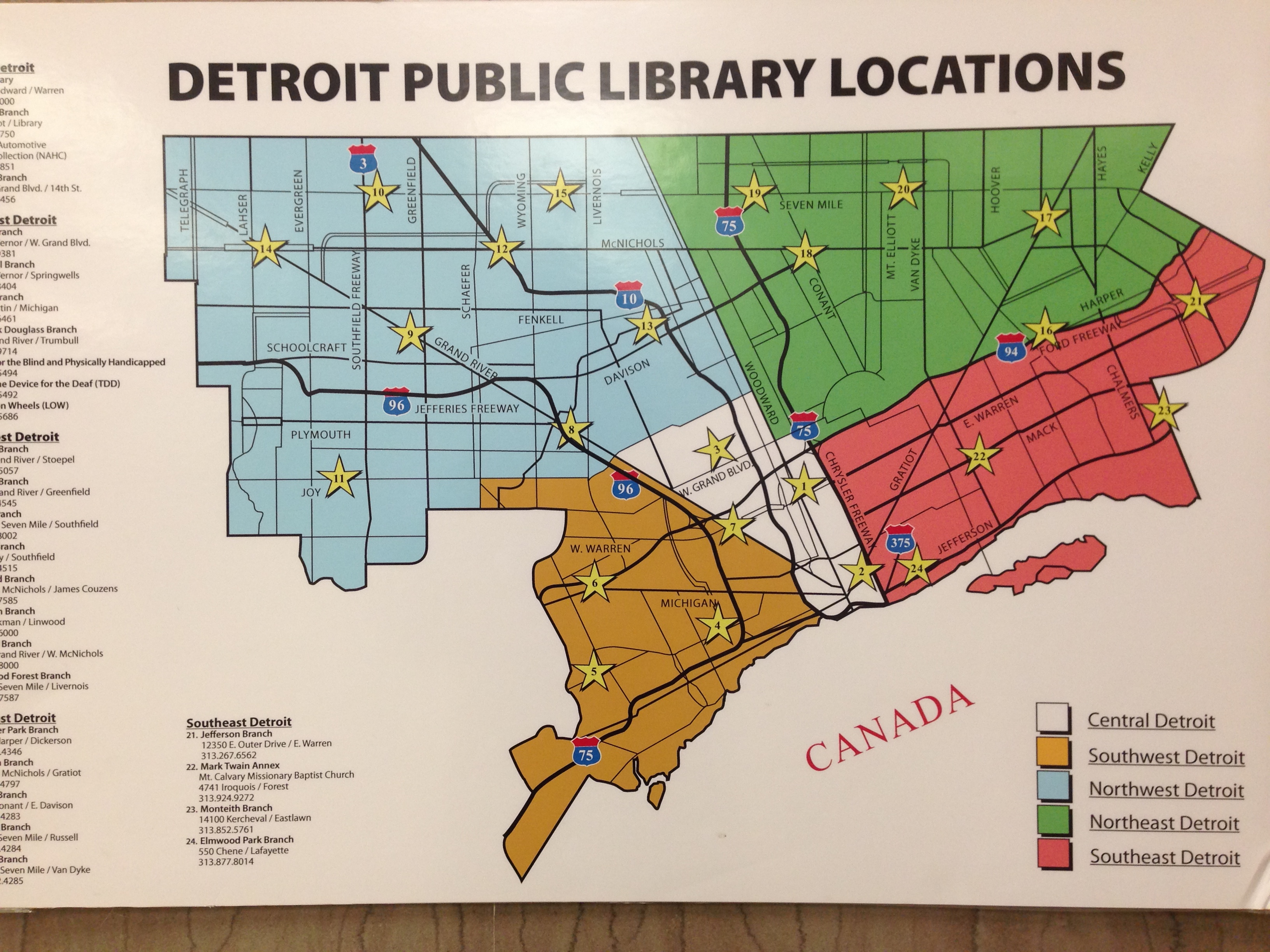 I discovered this map in the Detroit Public Library (DPL) Main Branch. My first thought was that many of the locations are no longer open. Then I noticed the way the city is broken into 5 parts, most interesting is the “Central Detroit” area. Anyone know where these areas may have come from?