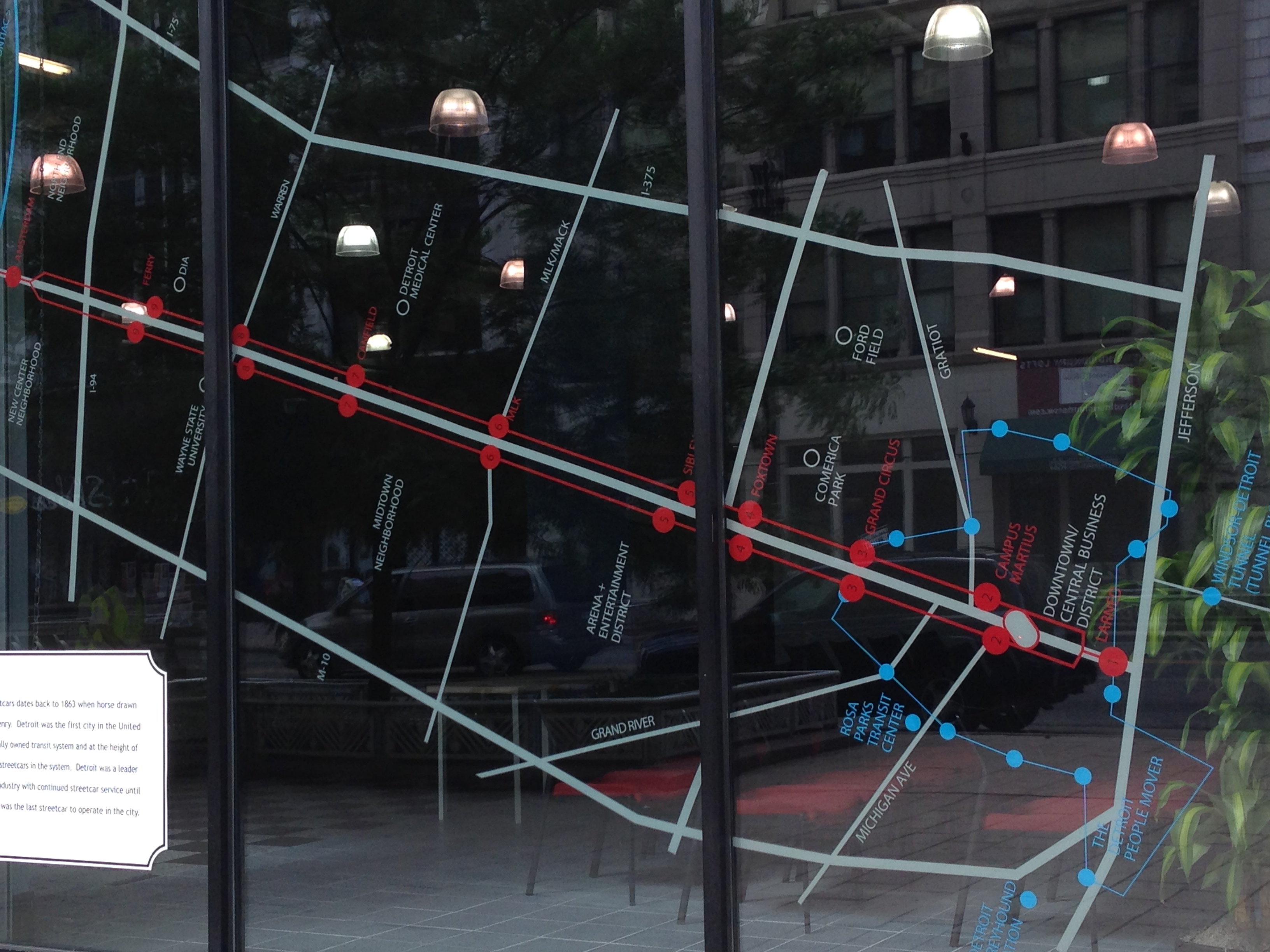 Spotted along Woodward, this window map stood out on a walk Downtown. After months of slow prep work being completed underneath Woodward Ave., the M1 Rail now has an official breaking ground date: July 28th. This also means that Woodward Ave. will be closed from Adams St. to Campus Martius for about 3 months. Be sure to attend one of the two upcoming community meetings.