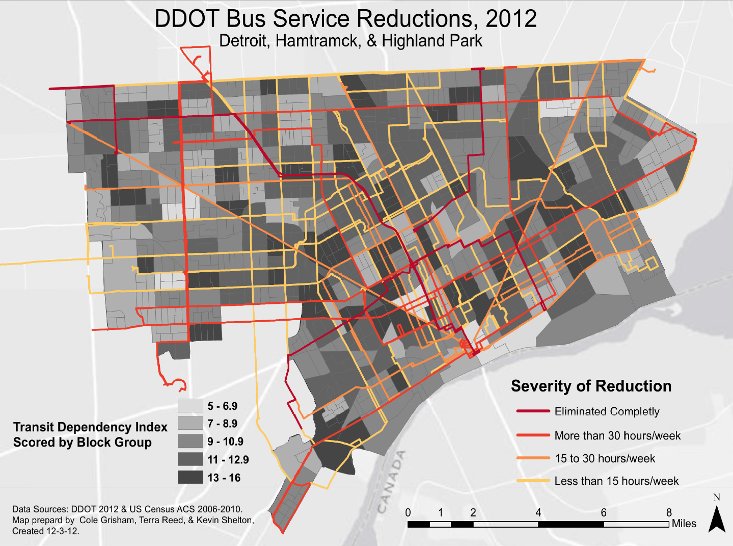 University of Michigan graduate students Nicholas Grisham, Terra Reed, and Kevin Shelton found that the 2012 reductions in DDOT bus service affected almost all routes whether it was a reduction of hours, days, or the entire route. They also found that transit dependency was spread out across the city. They developed a Transit Dependency Index (TDI) based on Census data of: vehicle ownership, elderly population, youth population, and median household income.