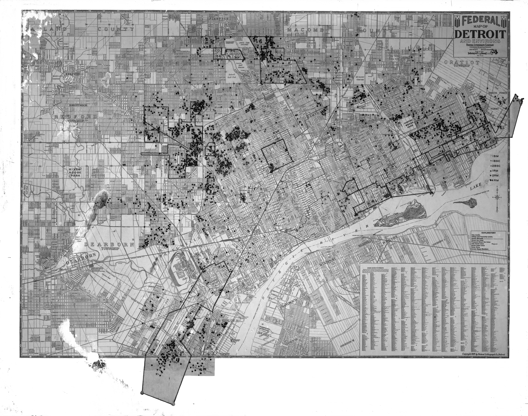 Based on the lack of streets & such in the upper right corner, in Gratiot Township, this predates the maximum borders of Detroit, achieved in 1926. What the black dots are is anyone’s guess. Because I can’t blow it up to read where they are this becomes a useless exercise beyond the most basic. There are rail lines there but some of the black outlines don’t seem to have any commonality. Things like Campau Woods Park & Connors Creek Park aren’t even a memory for most Detroiters.