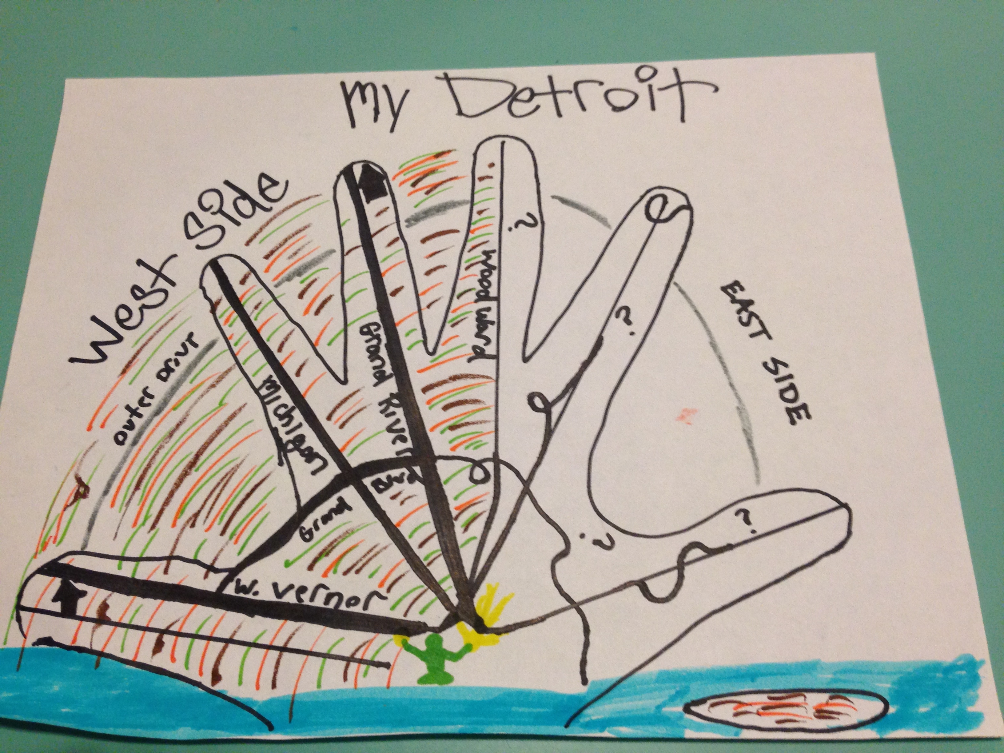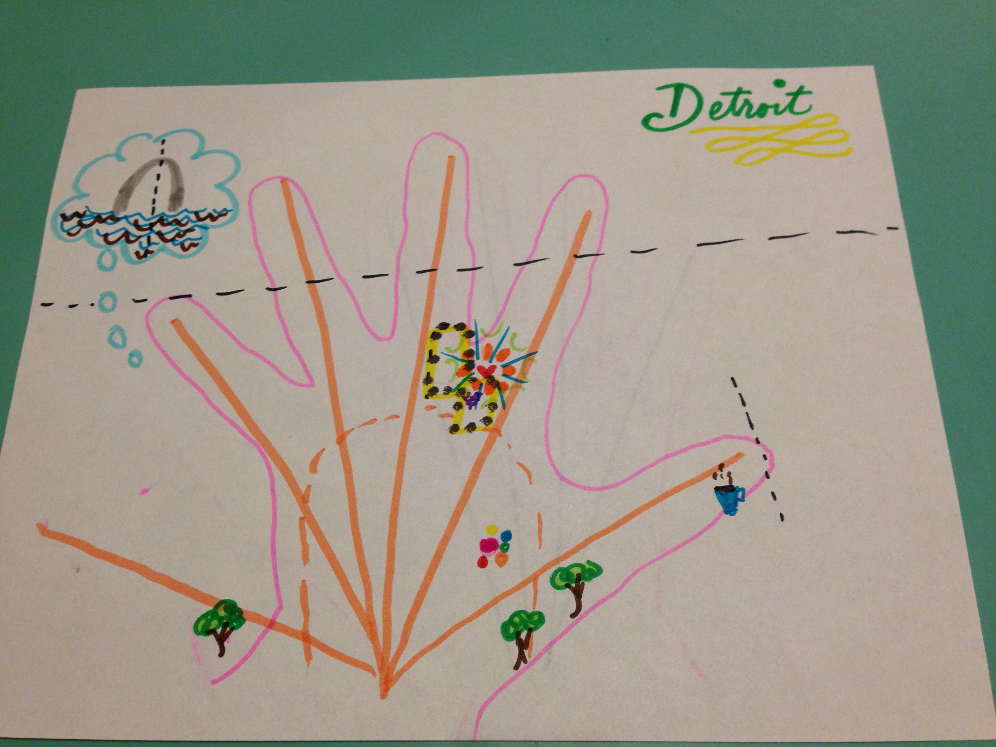 We started off the workshop with the hand map exercise and participants were asked to “map their Detroit” and the values and experiences they have gained from Detroit. Each of the participants had a different story; different sets of experiences, yet everyone spoke about the importance of people and the need to focus efforts on getting people what they need. I could never do justice to explain the details of every person’s hand map, so I will just summarize a few key points: