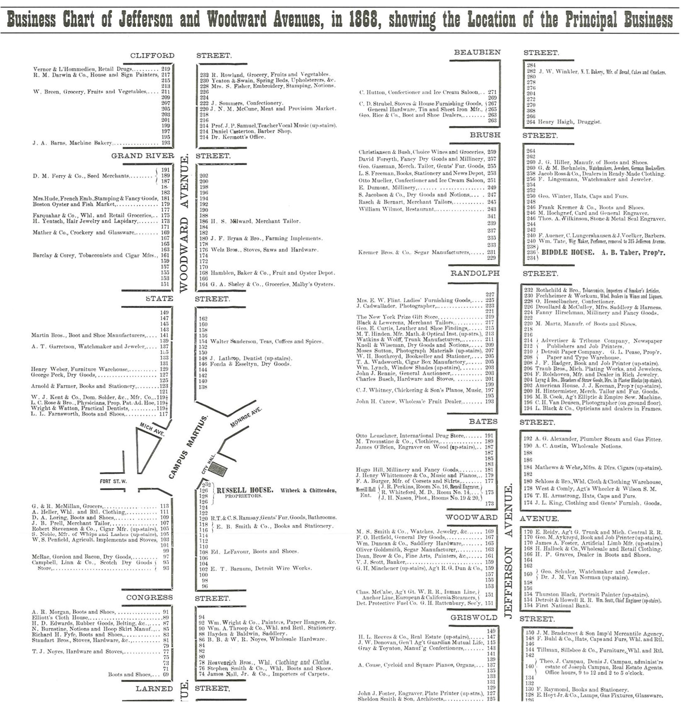 This map comes by way of the Detroit Historical Society. It is not a typical map, but provides an incredible look into the past at businesses located along Woodward Ave. and Jefferson Ave.