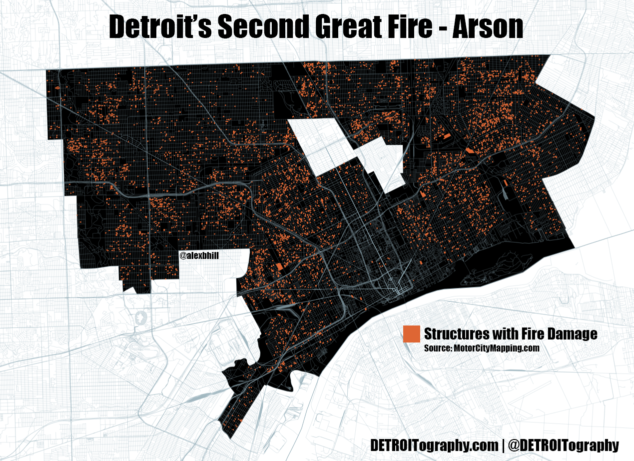 The recent Motor City Mapping (MCM) project identified 8,641 structures with fire damage. This number obviously can’t capture the issue of arson since the 1970s nor demolition of burned down homes, but is an important marker of what the city has faced in the past and continues to confront. The Motor City Muckraker has been cataloging faulty fire hydrants and their effect on the work of firefighters and families who lose their homes. Detroit’s second “Great Fire” may finally be waning, but significant infrastructure issues need to be addressed in order to ensure the safety of residents.