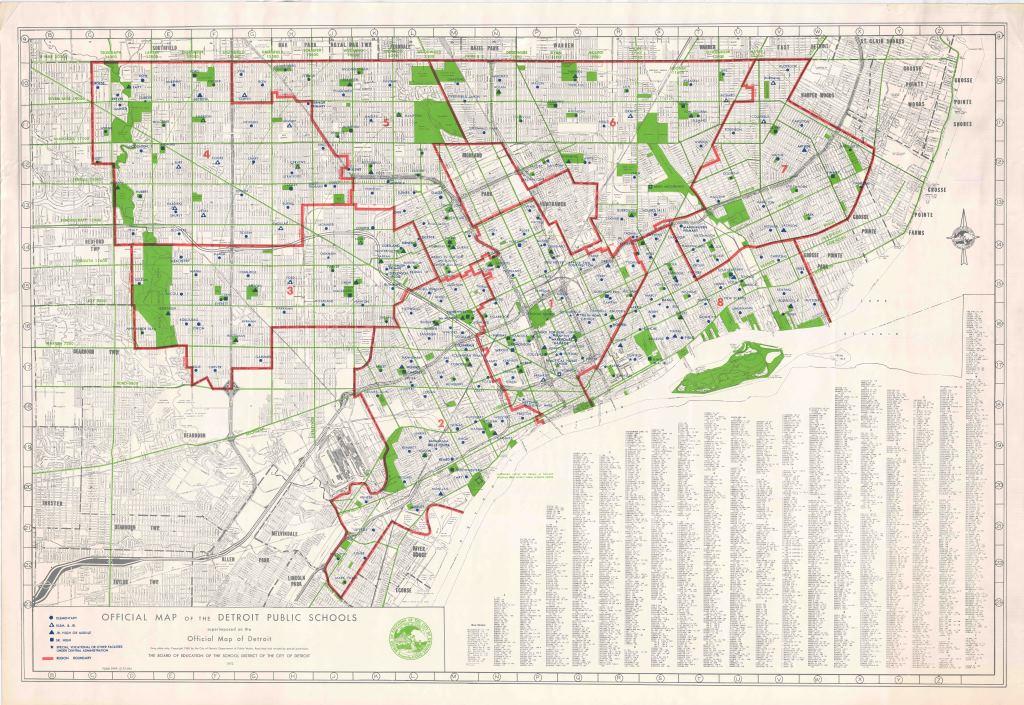 Yet another great archived map from the Detroit Historical Society. In this map you can see how Detroit evolved and grew with a higher density of schools in the older parts of the city (Greater Downtown) and more spread out schools in the annexed areas/ suburbs that later joined the city.