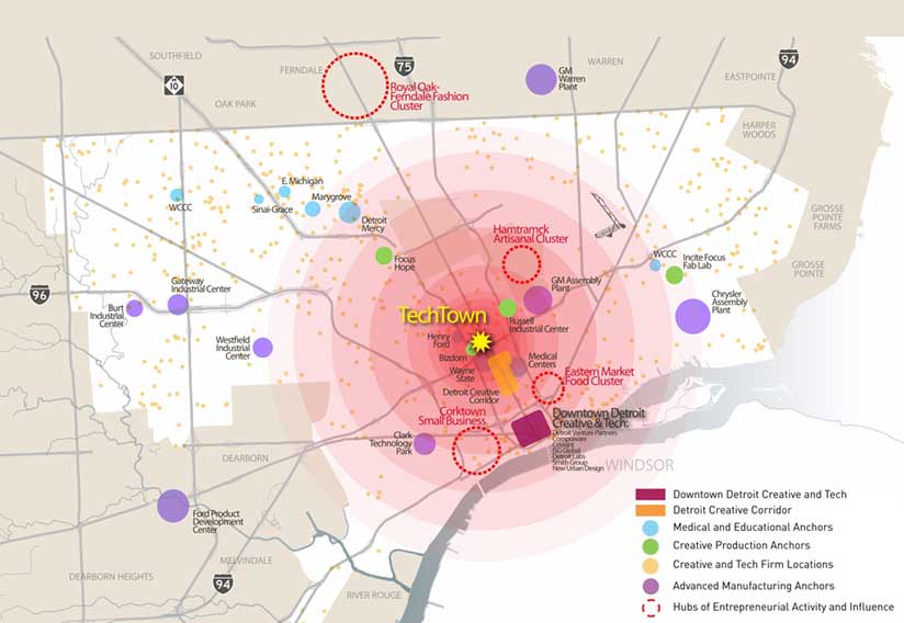There is a wealth of people and ideas in the area already with Henry Ford HQ, Wayne State’s new iBio medical research building completing construction, and the College for Creative Studies (CCS) existing work in the Argonaut Building. Wayne State has a 2020 vision to strengthen the campus along the Woodward Corridor, Henry Ford is investing in the area adjacent to TechTown, and Midtown Detroit Inc. recently finished a competition to improve the bridge underpasses (viaducts) in the area. The TechTown District would be a major connector between Midtown and New Center and would solidify connections between some of Detroit’s core institutions.