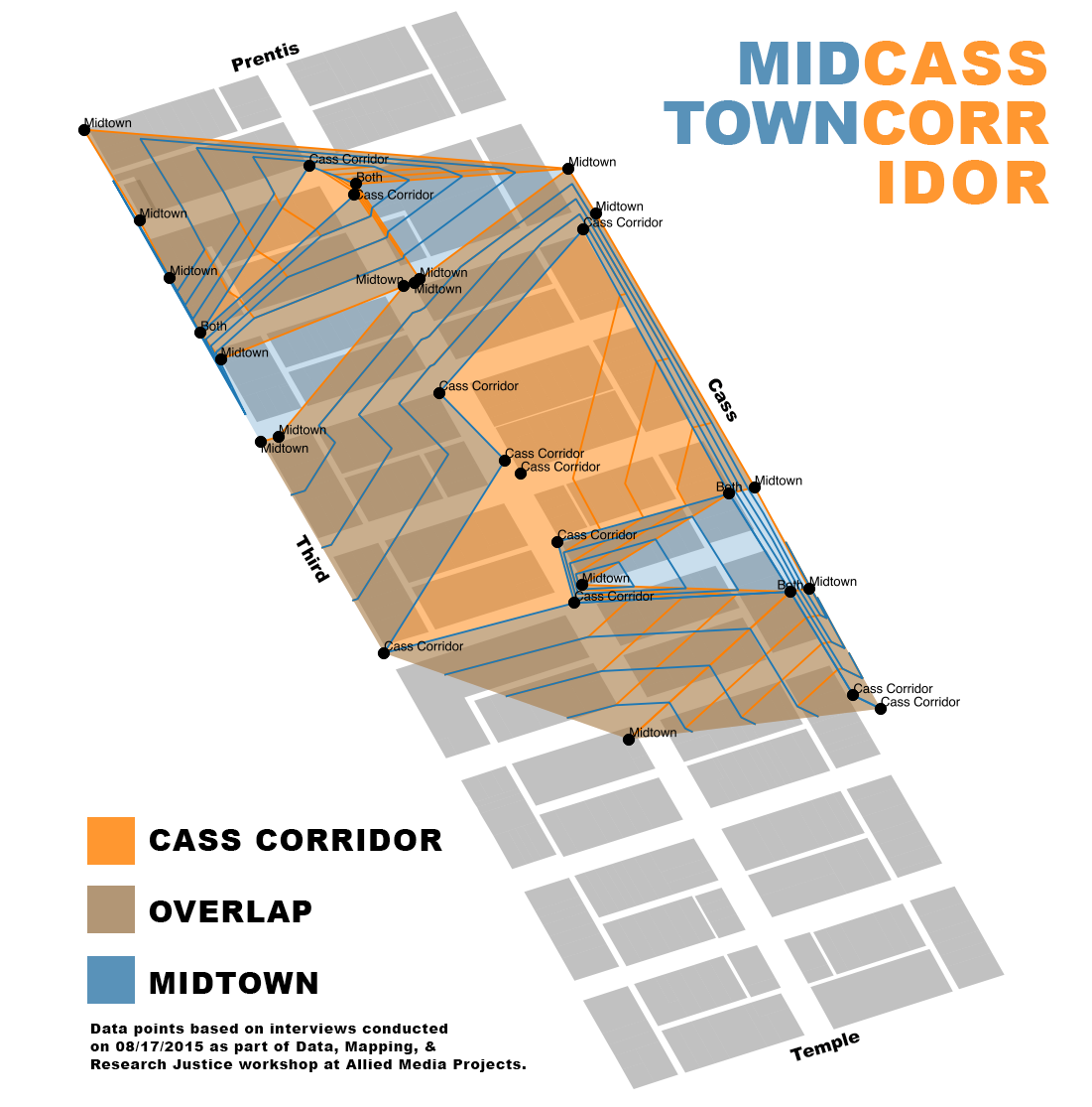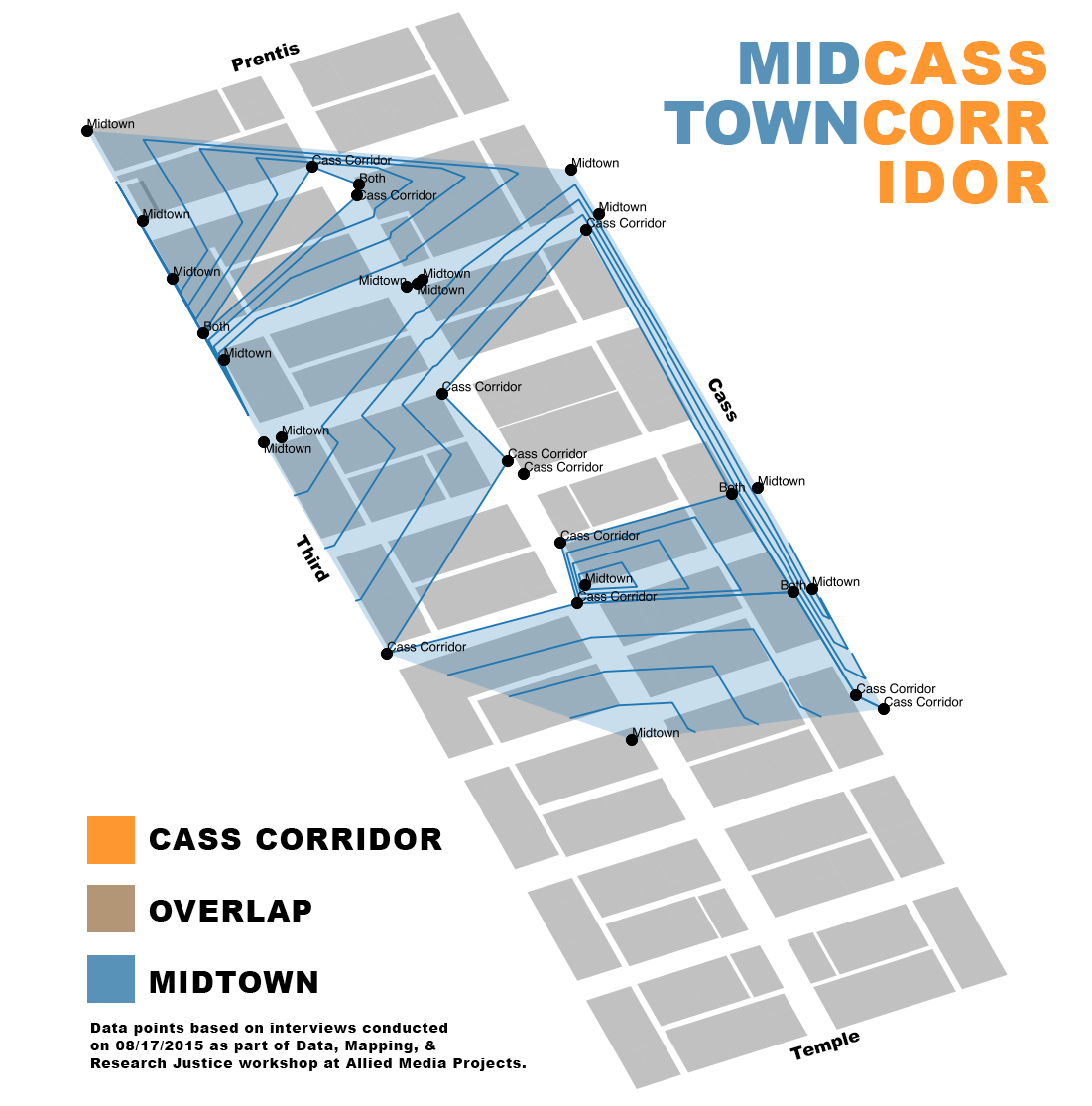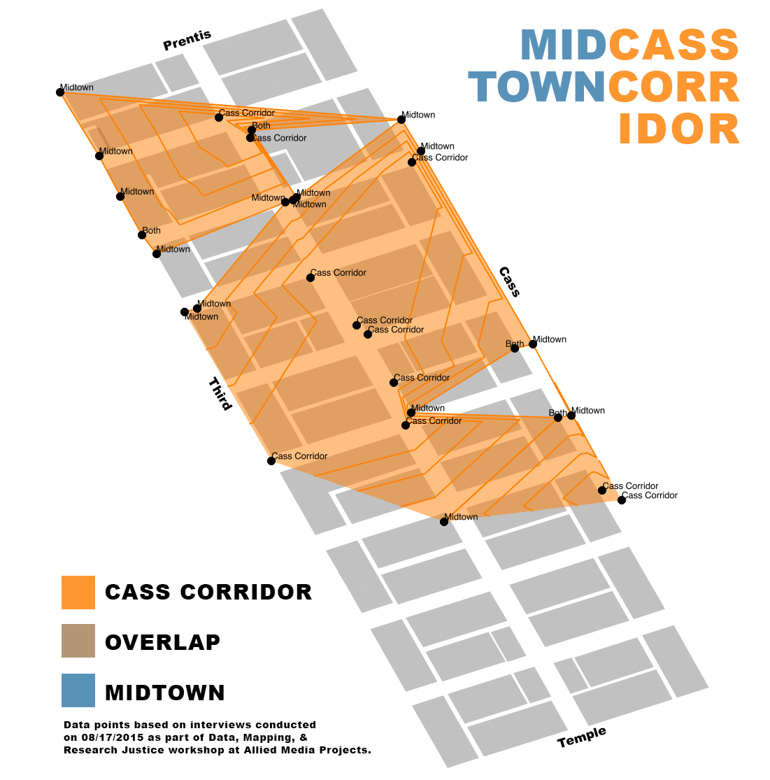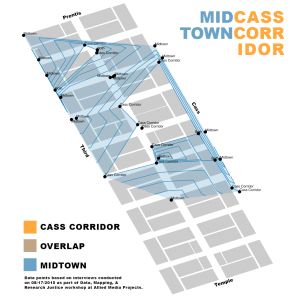During the Data, Mapping, and Research Justice workshop offered in August, participants conducted their own data collection based on shared research questions about the Cass Corridor. One question in particular that was brought up was what different people called the area: Cass Corridor or Midtown.