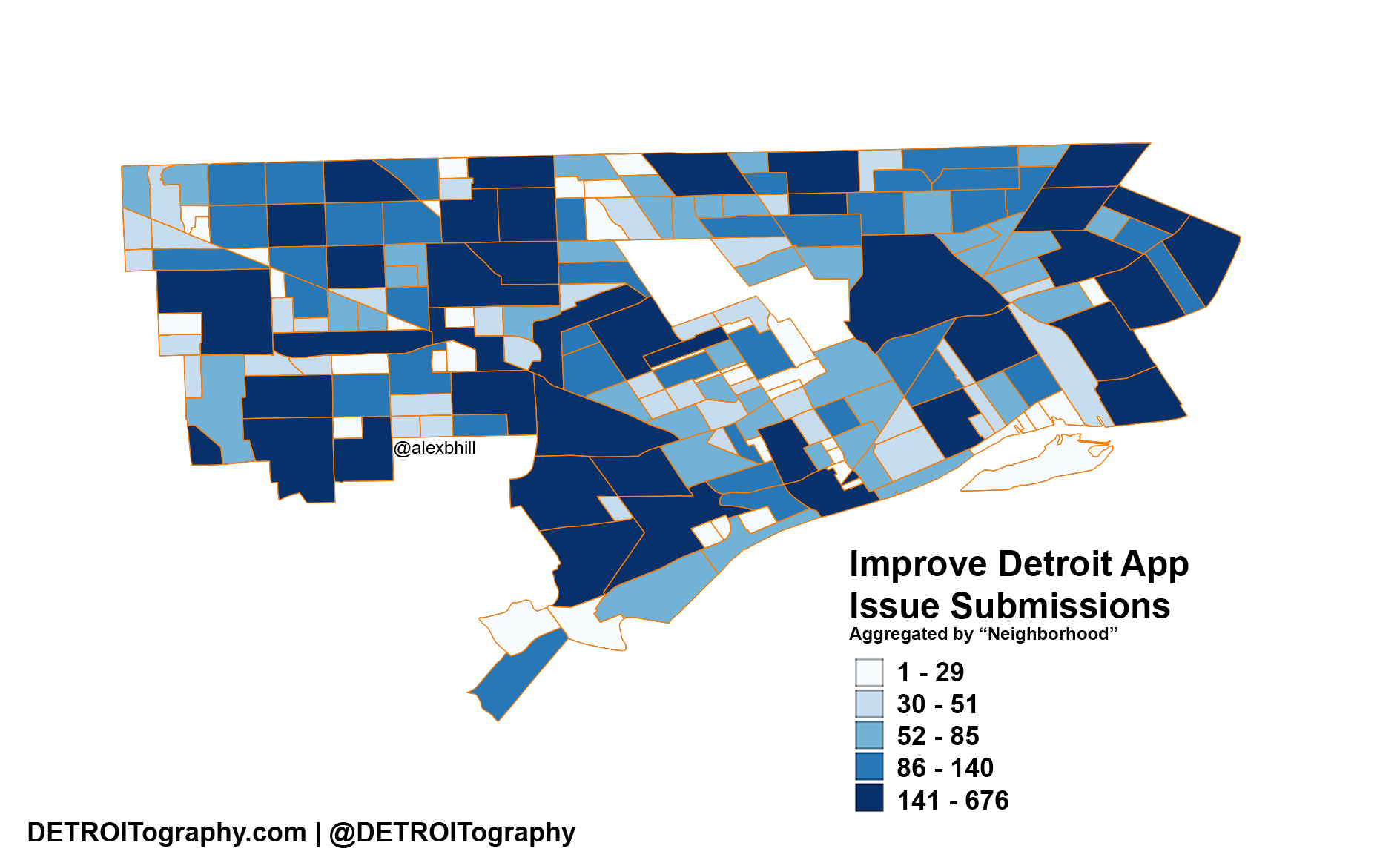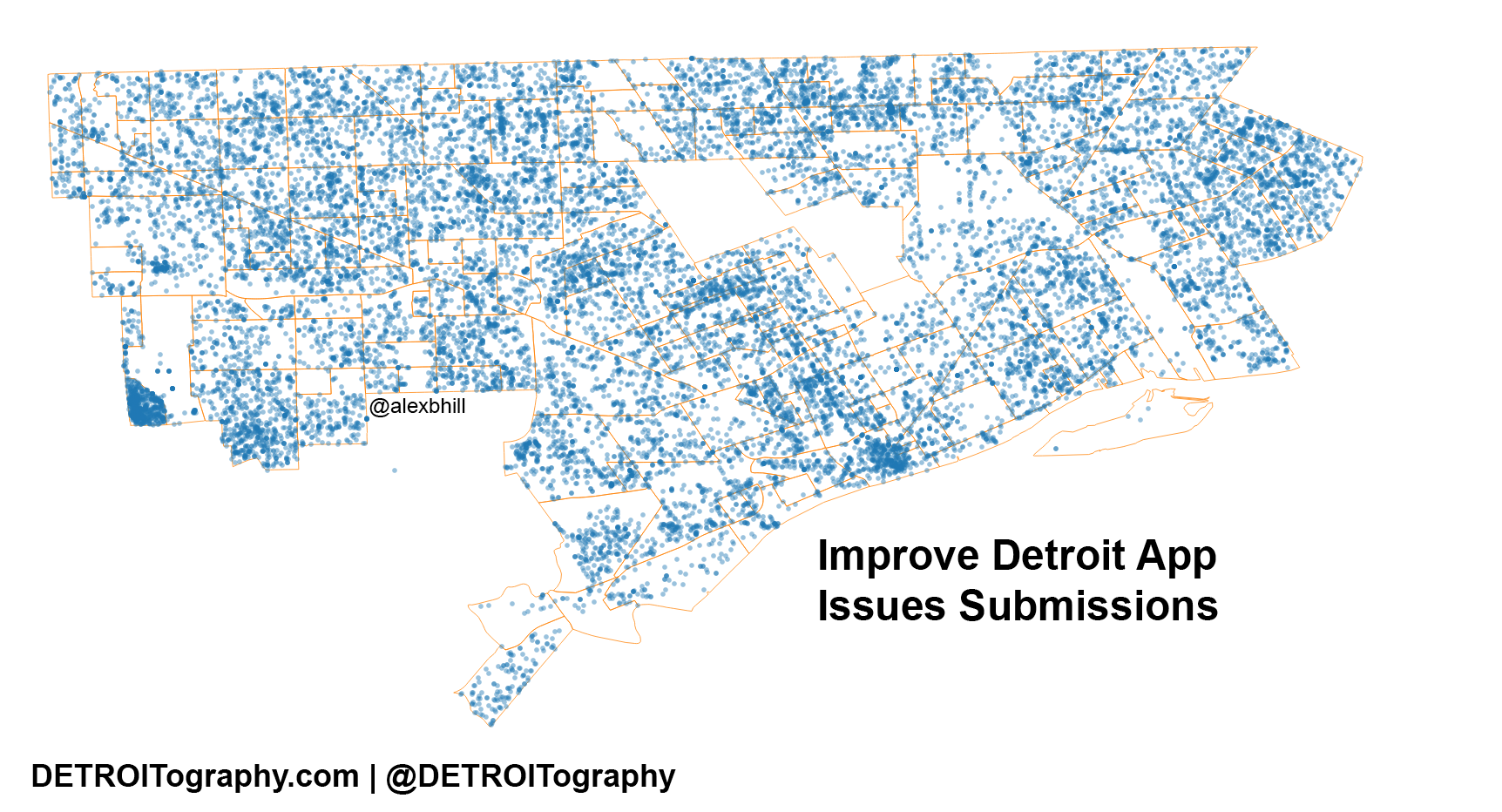 From the above map you can see the obvious outline of Detroit with low broadband internet access. Downtown, Boston-Edison, Grandmont-Rosedale, Palmer Woods, and a handful of other ‘higher’ income areas on the website have greater internet access. The Improve Detroit app submissions are clustered in areas with more internet, but you can see people are reporting from across the entire city.