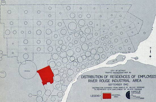 The geographic distribution of jobs and access to opportunity is a major issue of the current revitalization effort. Many people cannot easily reach jobs that they need because they are too far away in the suburbs. These maps give an interesting picture of where people lived and worked when Detroit’s major industries were moving full tilt. All in all, people mostly lived fairly close to where they worked. The Henry Ford River Rouge Plant (above) was a key employer of the day in 1942, the jobs are not as many these days. Much of their workforce was pulled from Dearborn, but a substantial number of people lived nearby across Detroit. det-employees-connor-jefferson