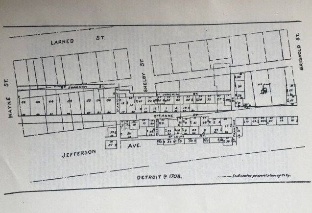 In order to prove the accuracy of the map, I had it traced on the present city map, and find the lines of lots existing before the fire of 1805, many of which still serve as boundary lines of present buildings, coincide very nearly with the Cadillac conveyances.”