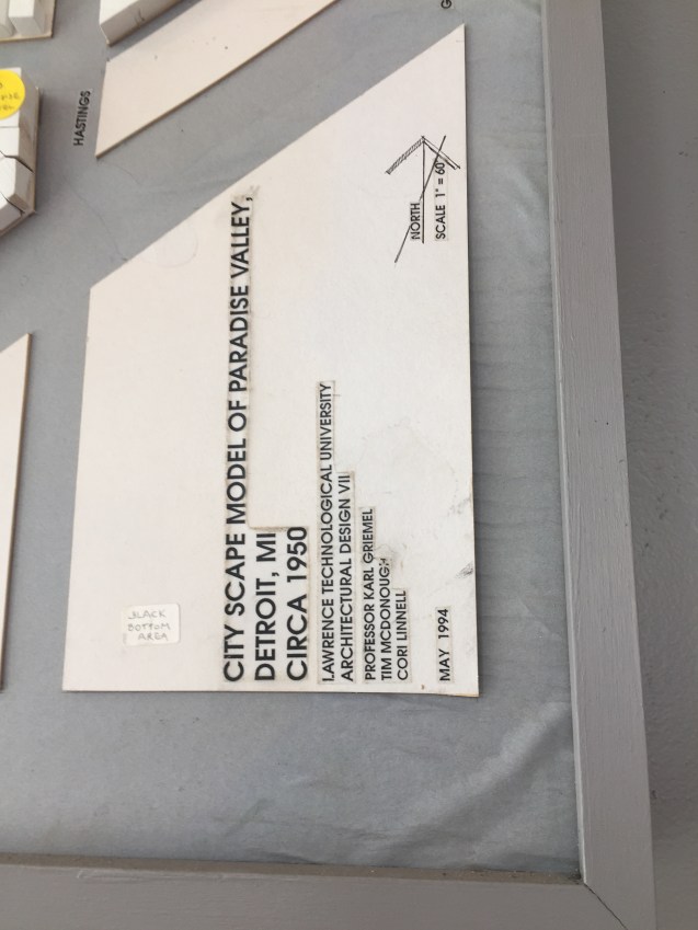 I happened to visit Dilla’s Delights for a quick coffee refuel while Downtown and was pleasantly surprised to have a historical streetscape popping out of the wall. The model is credited to an architectural design course at Lawrence Technological University in 1994.