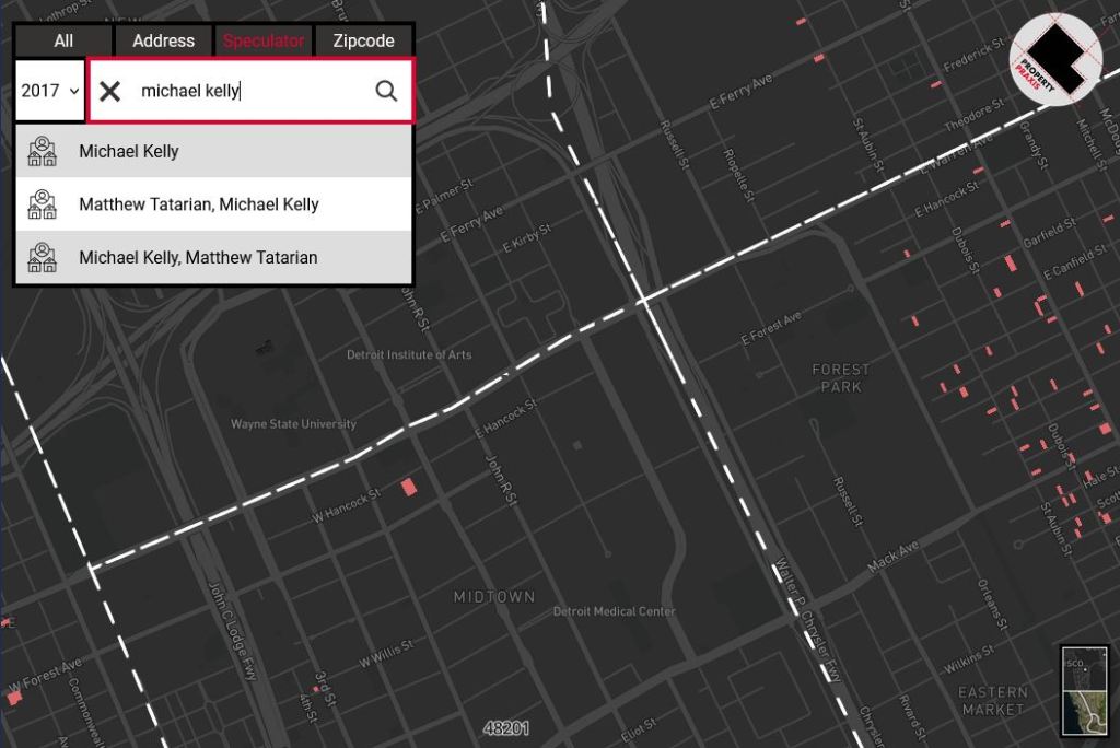 In addition, Kelly holds a number of parcels near potential development sites, buying low, doing nothing, and waiting to sell to the developer or city at an inflated price. Some of these properties are held by non-profits under names like Detroit Youth Gardens LLC.