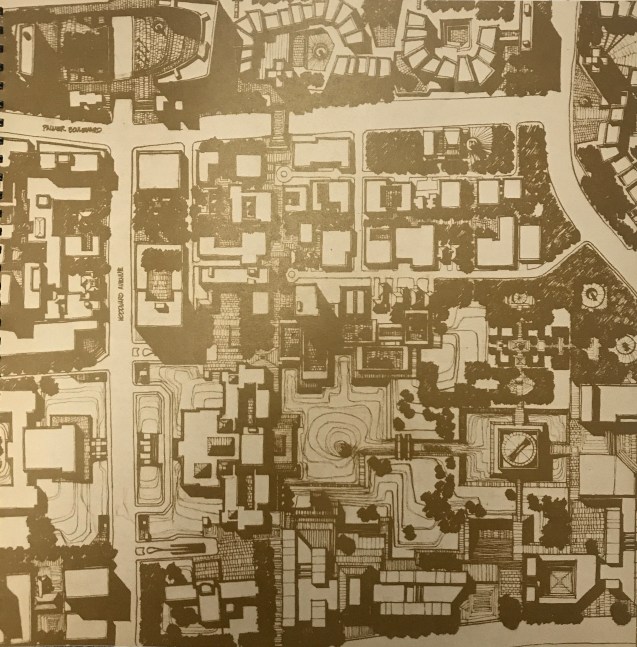 This map comes from “Detroit 1990: an Urban Design Concept for the Inner City” that the Department of City Planning published in 1970. This concept for the Cultural Center is especially interesting as competition continues to select a new concept for the DIA Plaza | Midtown Cultural Connections effort.