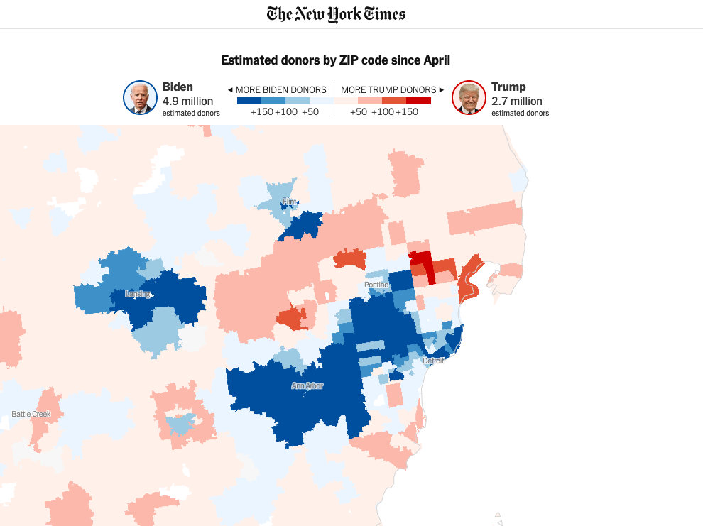 No real surprises here, you can pick out the largest cities in Southeast Michigan based on more Democratic candidate donations. The New York Times and many other groups have visualized pubic data from the Federal Election Commission (FEC) campaign donation records.