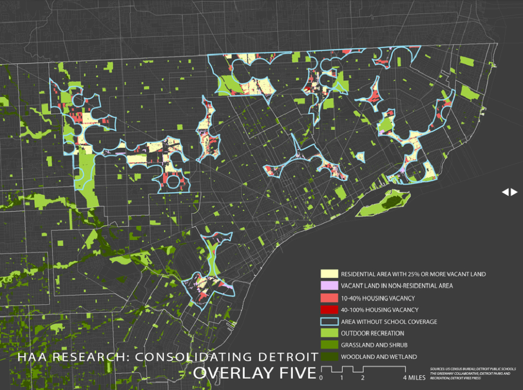This work is history now, but the push for consolidating and “right-sizing” the city has been met with concern and condemnation. Hamilton Anderson and Associates (HAA) has been at the forefront of leading efforts to reimagine the city through the Detroit Future City plan and this map shows their early concepts from December 2009.