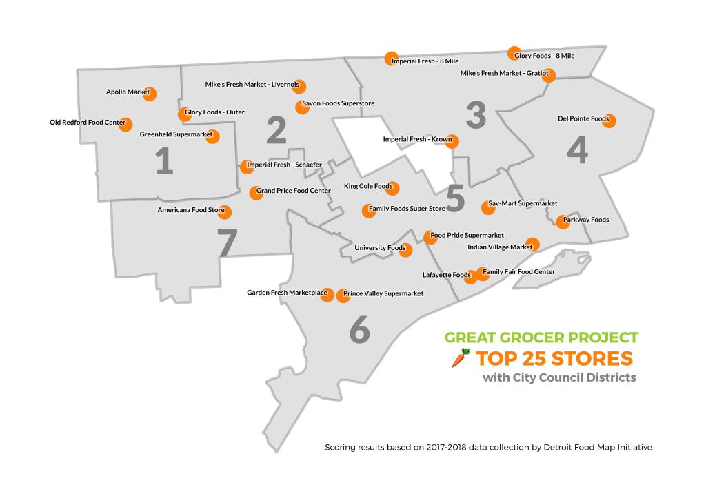 This map is for the top 25 independent grocery stores (excluding Meijer, Whole Foods, Save-a-Lot, and Aldi), but all 68 stores in Detroit were scored. Harper Food Center was one of the top 25 stores before it burned down in late February.