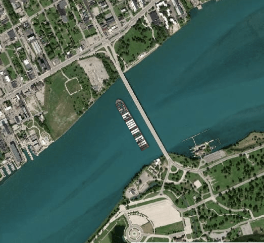 Garrett Dash Nelson of the Boston Public Library’s Leventhal Map and Education Center built a quick app to place the massive container chip anywhere and everywhere. Here is the Ever Given next to the Belle Isle bridge.