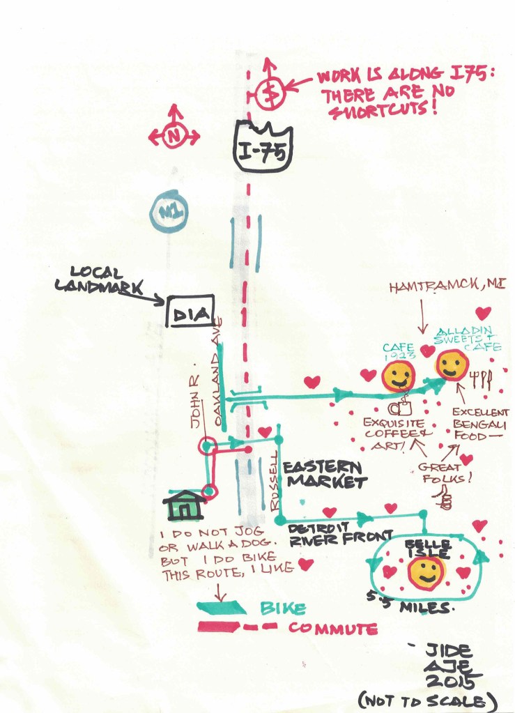 This hand drawn map by ‘jide Aje is a part of a series of hand drawn maps in a Volume 2 of Detroit Research Journal. The map is part of the “Drawing Detroit” series which aims to collect personal and hand drawn maps of Detroit.