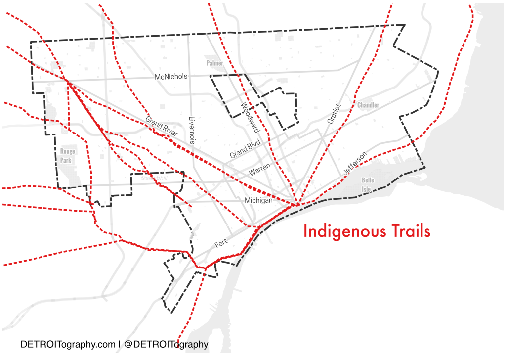 Detroit’s street design with its hub-and-spoke pattern Downtown are often attributed to Western men with grand idea after Detroit’s “Great Fire of 1805.” The story goes that they imagined Detroit in the image of Paris or Washington D.C. – but in reality Detroit’s unique radial streets come from the pathways created by indigenous peoples living on this land before any Frenchman arrived.