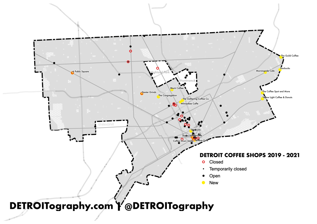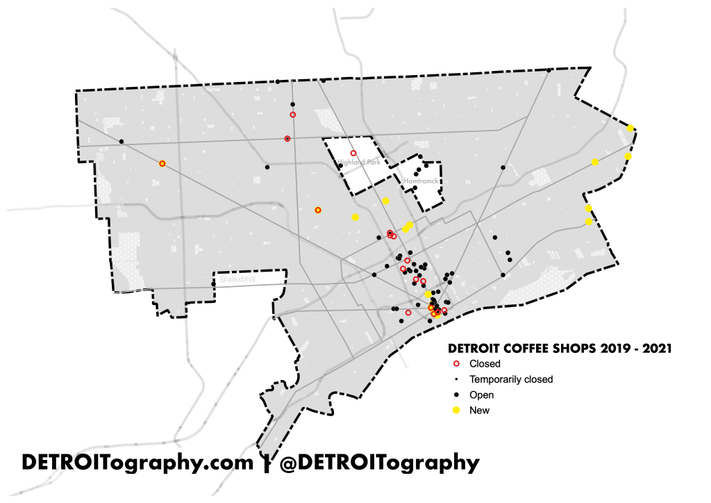 Detroit has 82 coffee shops. Since 2019, 16 new shops opened and 13 closed. During the COVID-19 pandemic, 11 coffee shops temporarily closed and 8 have reopened, at least for takeout.