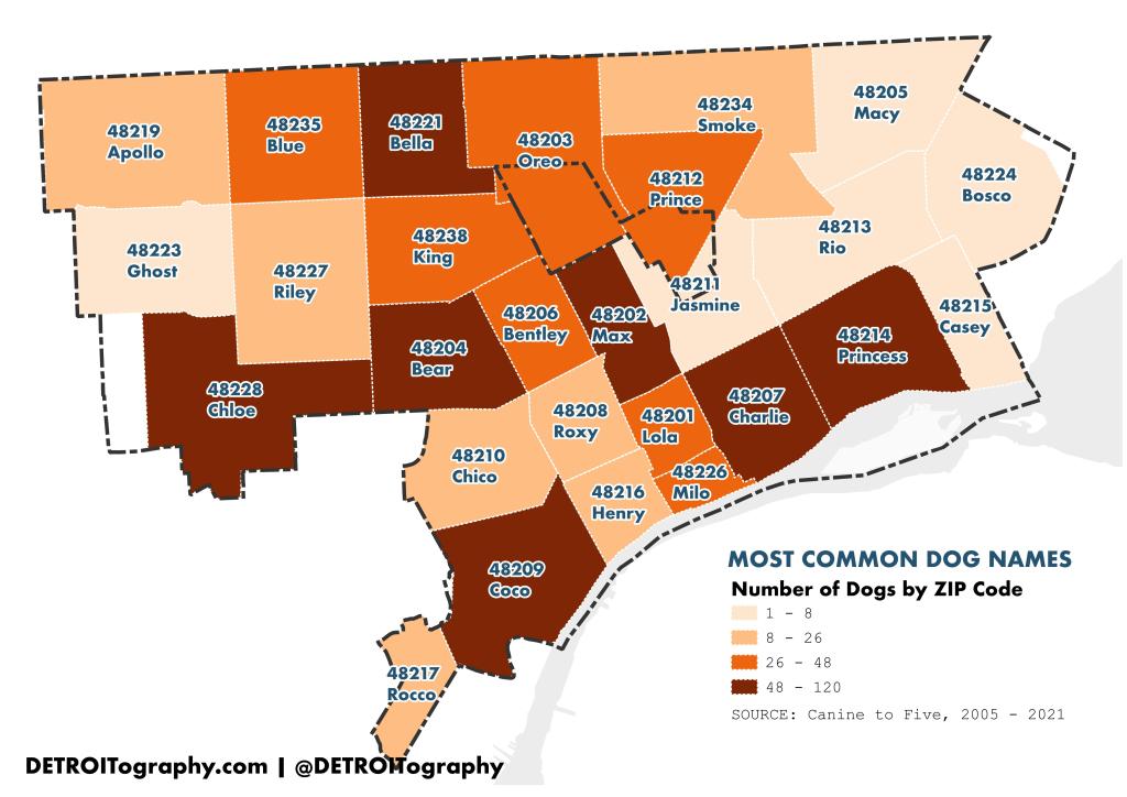 Many Detroiters have dogs as pets and thanks to our friends at Canine to Five we explored the most common dog names by ZIP code in the city. If you meet a dog that you don’t know try saying, “Hi Bella” or Bear or Coco or Max.