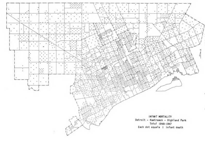 This map was included in the report “Areas of Social Need in Detroit and Neighboring Communities” and published by the Research Department of the Council of Social Agencies of Metropolitan Detroit. The Research Department generated nine different indexes of social need with “infant deaths” being its own category. The report notes that although infant mortality is not as bad as the past, it was still a significant health problem.