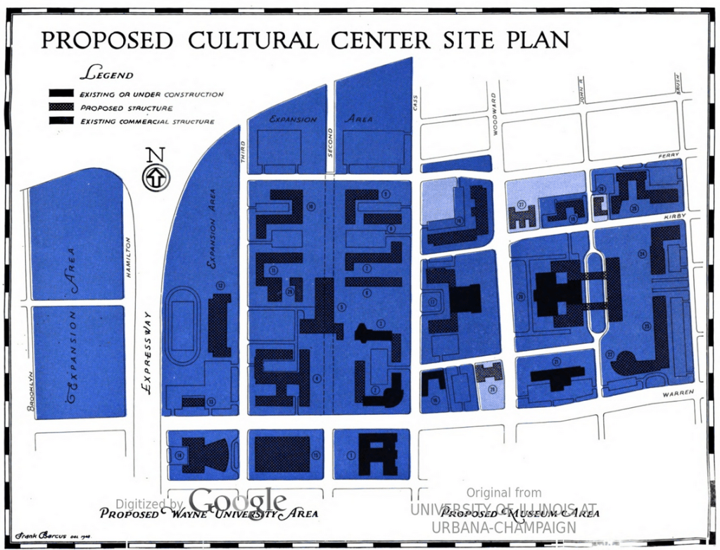 This map comes from the seventh report in the 1948 master planning series. At the time many of our current institutions were still under construction. WSU was building Science Hall, State Hall, and the Engineering Building. The Detroit Historical Society museum and International Institute weren’t yet built.