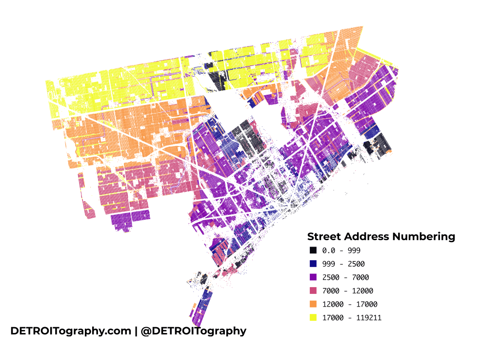 In Detroit, all streets were renumbered in 1920. Effective on January 1, 1921 the numbering scheme that is used today in Detroit remains, however you can still see the remnants of Detroit’s past urban planning and development efforts. The historic city center and areas along the riverfront retain the lowest numbers along with the oldest streets that run North-South. Detroit annexation expanded the land area of the city as well as the dominance of East-West streets. Much of the purple falls below Harper Avenue while everything in yellow is above McNichols/Six Mile.