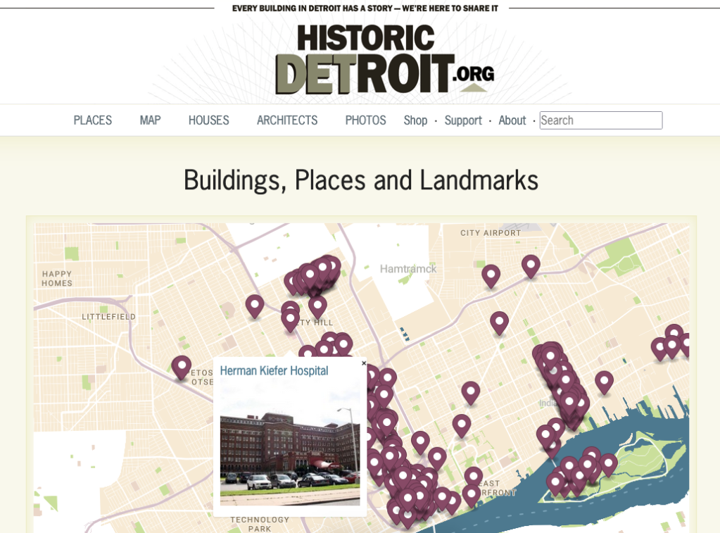 The HistoricDetroit.org site by Dan Austin is an internet gem. I was so glad to wander back and find he’s added a map function to search for historic buildings by location. There is a strong focus on the urban core to the historic building locations, but that follows the city’s growth and development. Indian Village on the city’s Eastside is the other dense segment of historic building lore.