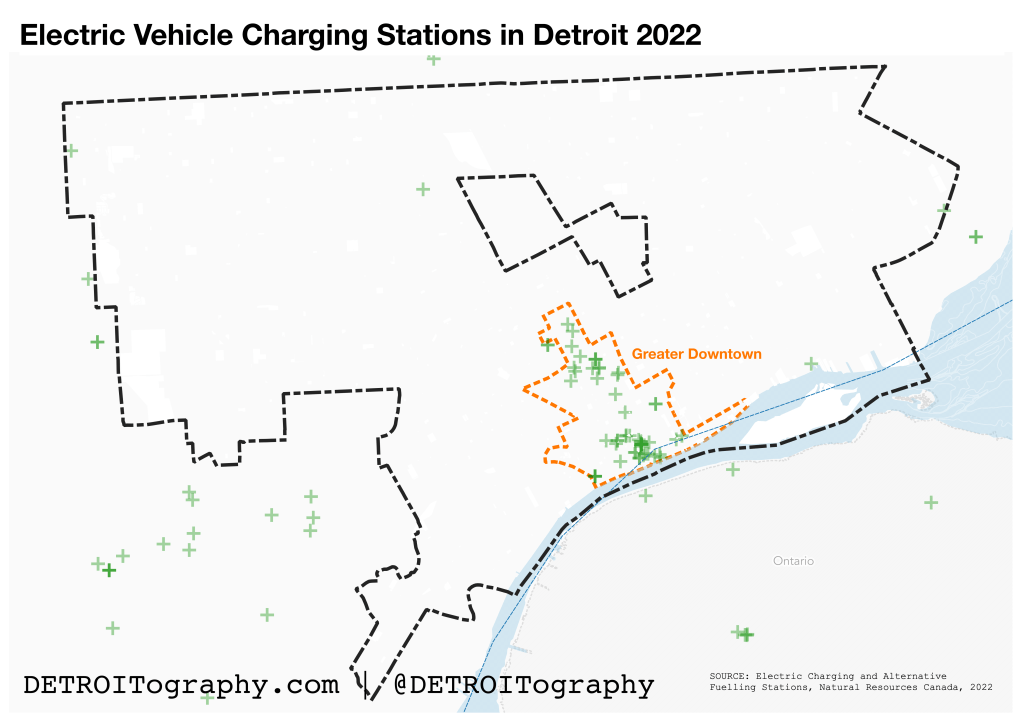 However, our infrastructure has a long way to go to make EVs a viable option for everyone. That is low-income and communities of color are extremely underserved by EV charging stations. In Detroit you have to live in the 7.2 square miles of “Greater Downtown” to have any luck. Charging stations are just one part of the equation. The other is our outdated electric grid. In these same areas of Detroit where there are no EV charging stations, the electrical infrastructure is a decade past its life expectancy and has 16% the hosting capacity compared to areas that have been modernized like Greater Downtown. Beyond EV charging, this unreliable infrastructure limits low-income communities from taking advantage of home solar to reduce costs of heating and cooling as well.