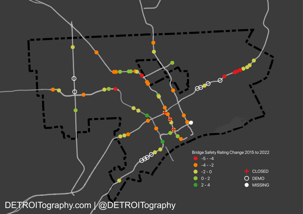 This map specifically shows where bridge ratings have gotten worse. The majority of I-94 pedestrian bridges are just continuing to fall into disrepair with no clear plans from MDOT for investment or improvement. Most concerning are the closures of pedestrian bridges near Detroit’s core. Access to amenities and jobs are critical when as many as 25% of Detroiters don’t have access to a car. A large number of bridges slipped into the orange category, just a few data points away from being too dangerous.