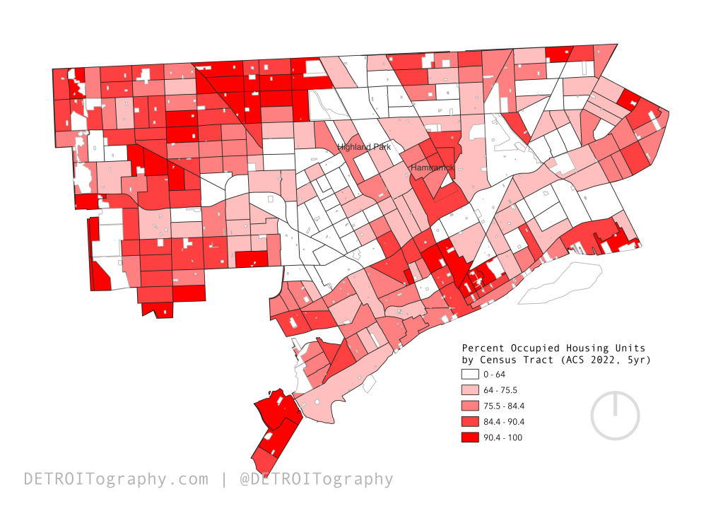 The next best option is Census data on occupied housing units or USPS data on vacancy. I try to opt for the more positive data indicator with where people are in housing. We see a familiar pattern that maps onto the population dense clusters across the city.