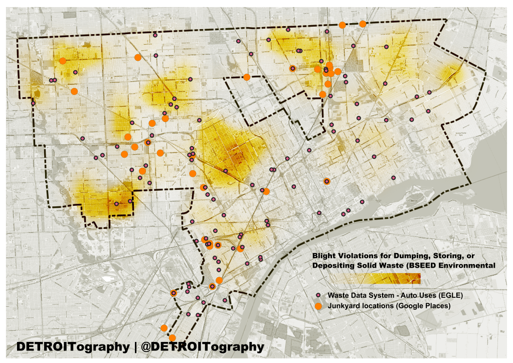 The State of Michigan Department of Environment, Great Lakes, and Energy (EGLE) ended up having a more helpful and knowledgeable social media team than their legal team handling FOIA requests. I was able to search the public “Waste Data System” to find 110 used auto parts and metal recycling sites. Still a very low number compared to the 452. A quick search of Google Places also got me to the number of “junkyards” in the city (n=37).