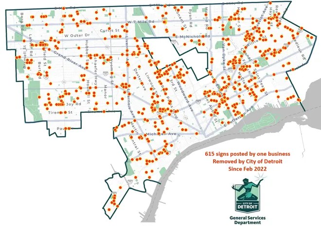 This map comes from reporting by Sarah Rahal about the abundance of signs placed by local and regional businesses all across the city. The City of Detroit seems to be implementing its “sign ordinance” against unapproved commercial signage along with enforcement.
