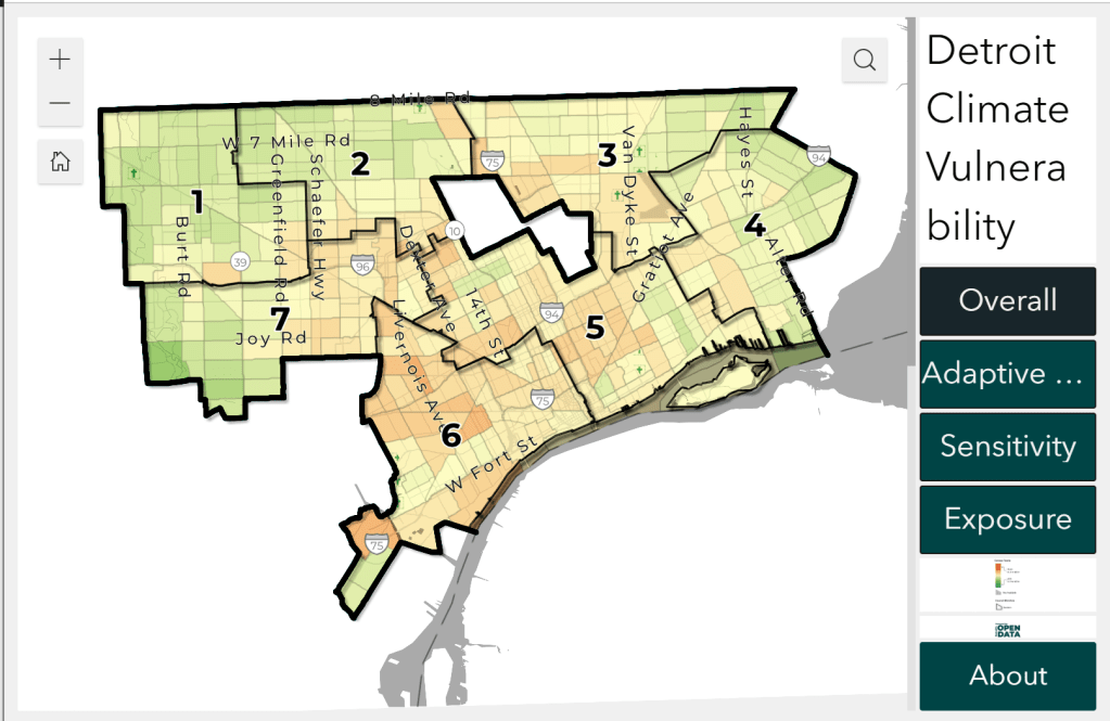 This map is part of the City of Detroit Climate Strategy informed by the Climate Equity Advisory Council. The goal of this map is to visualize climate vulnerability factors at the census tract scale. From the site: