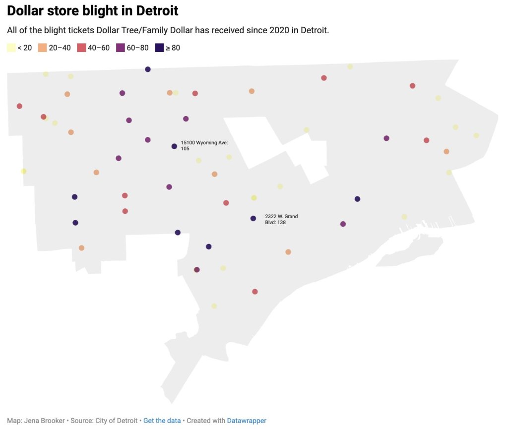 Bridge Detroit reporter, Jena Brooker, did some incredible open data digging to find that Dollar Tree, owned by Family Dollar, was cited with 2,400 blight tickets since 2020. Dollar store moratoriums have been put in place in more than 50 cities. Nationwide, dollar stores are known to have higher rates of crime, lower quality products, and have a negative effect on suppressing new grocery stores.
