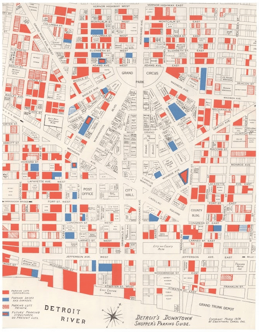 The pamphlet guide and map were produced by Educational Cards Inc. and are clearly hand drawn and hand colored to denote parking lots and parking decks or garages as well as future parking. Detroiters and national pundits alike often shout the ills of dedicating land to parking, but perhaps the real metric is the parking space relative to population?