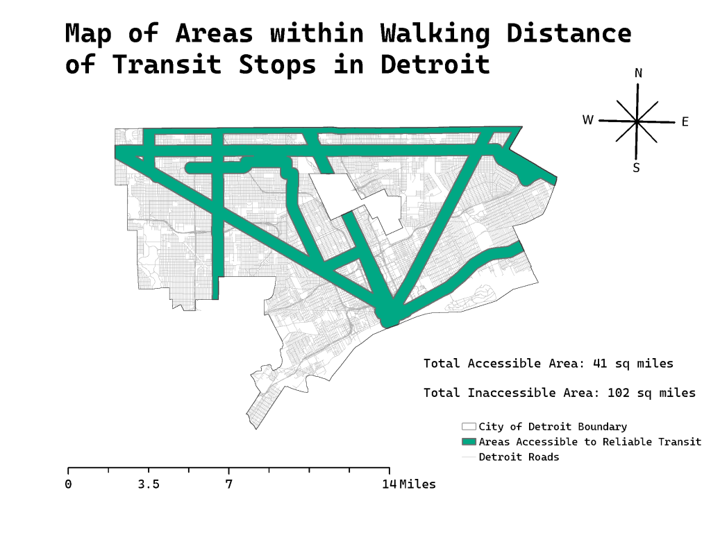This was done by importing transit stop and route data for the QLine, People Mover, DDOT buses, and SMART buses (in addition to street and city boundary shapefiles) from data.detroitmi.gov. I then, capped the frequency at 20 minutes for peak times to show which routes operate with lower headways. These routes included the People Mover, QLine, and eight DDOT bus lines, including the: #3 Grand River, #4 Woodward, #6 Gratiot, #7 Seven Mile, #9 Jefferson, #10 Greenfield, #16 Dexter, and #17 Eight Mile routes. None of the SMART bus routes have headways of 20 minutes or less. Then, I created a quarter-mile buffer around these transit lines to show which parts of the city