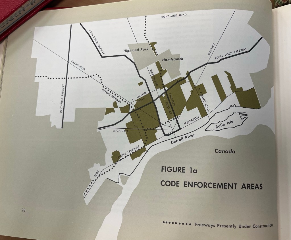 I was pleasantly surprised by the maps in the report: “Detroit: A New City” from the Mayor’s Committee on Community Renewal and prepared by the City of Detroit, Department Report and Information Committee. The city’s Community Renewal Program (CRP) was the vehicle for studying and planning Detroit’s future amidst the federal urban renewal regime. For better or worse the CRP produced numerous reports and maps that chronicle the condition of the city at the time. In particular this map of code enforcement, mostly focused in the “The Middle City” stood out to me as in present day Detroit these areas have seen a fair degree of reinvestment.