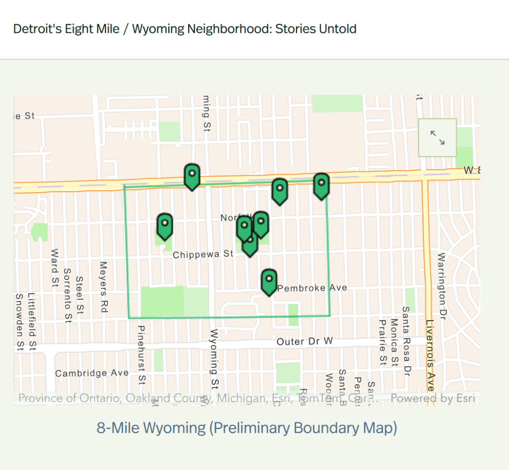 Detroit’s Eight Mile-Wyoming neighborhood is the oldest Black neighborhood in Northwest Detroit. The neighborhood signified a starting point for many working-class Black Detroiters; one of homeownership, hopeful revitalization, and a sense of community. Numerous resources remain in the community that highlight significant moments in African American and Civil Rights history. We invite you to explore these sites with us and learn more about the people and places of Eight Mile-Wyoming! This Story Map was a part of the Eight Mile-Wyoming Intensive-Level Survey project and was supported in part by an Underrepresented Communities grant from the Historic Preservation Fund administered by the National Park Service.