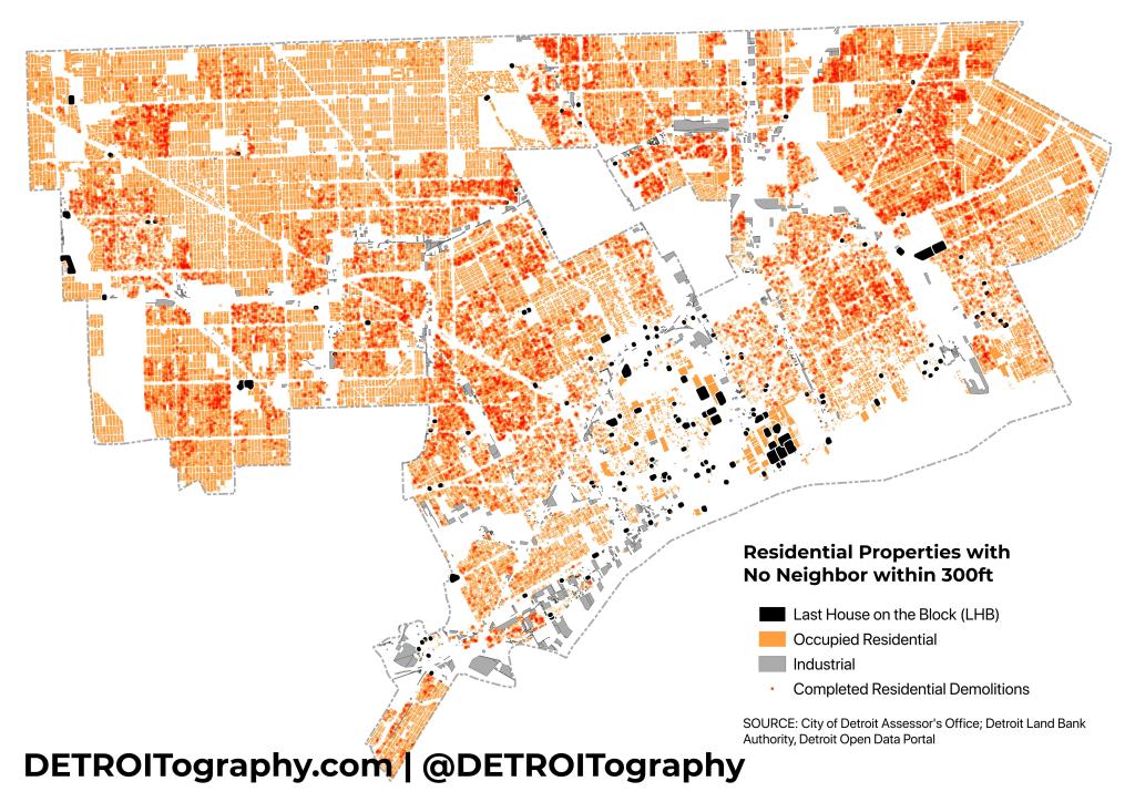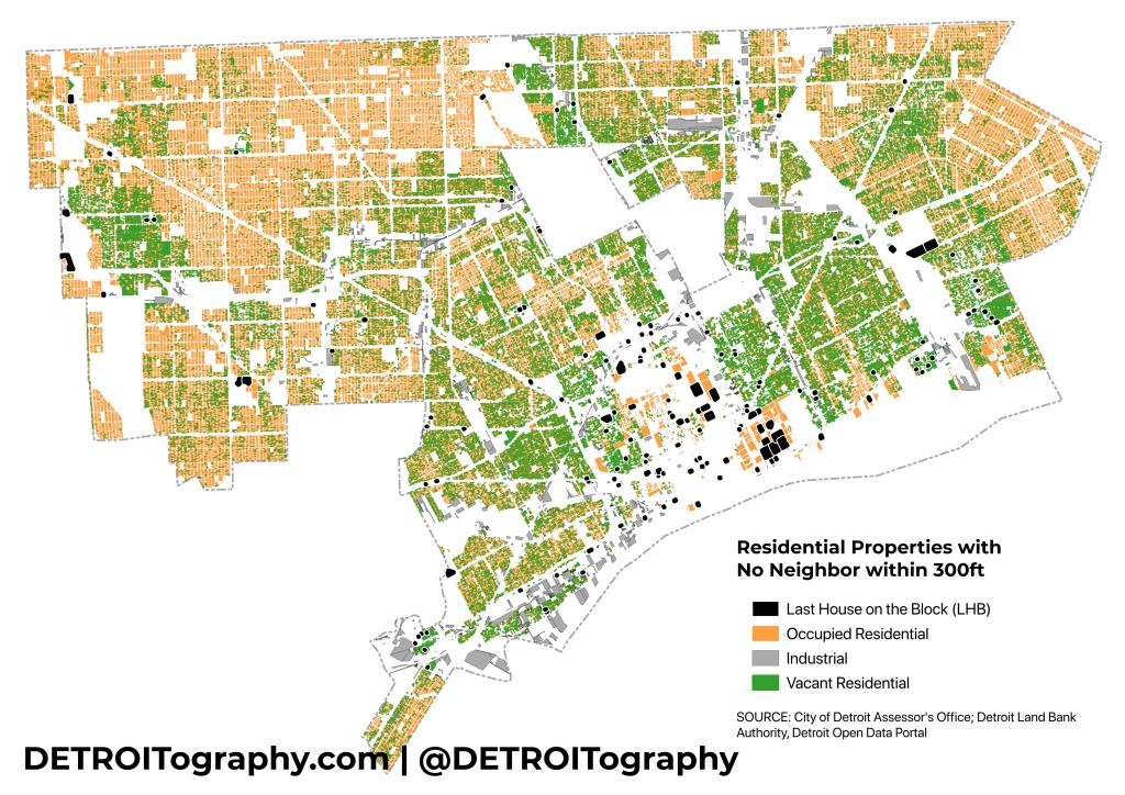 I decided to test the LHB concept in 2024 after the city has seen mass demolition of over 29,000 homes since January 1, 2014 through the Detroit Land Bank Authority (DLBA) and an influx of targeted investment in the last decade. Utilizing the City of Detroit’s parcel file from the open data portal, I selected all properties coded for residential, single family, apartment, multi-family, and their related codes. I used Rob’s same radius of 300ft and identified 155 LHBs in Detroit. In 13 instances it appears that the demolition program eliminated LHBs that had come up in my previous data analysis.