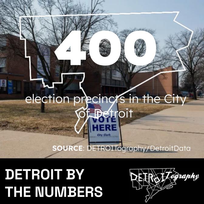 election precincts (cleaned up version) down from 502 precincts in the 2020 election and 450 in the 2022 election with 401 polling places, yet some people travel more than 3 miles past 6-7 polling places to reach their assigned polling place (DETROITography)