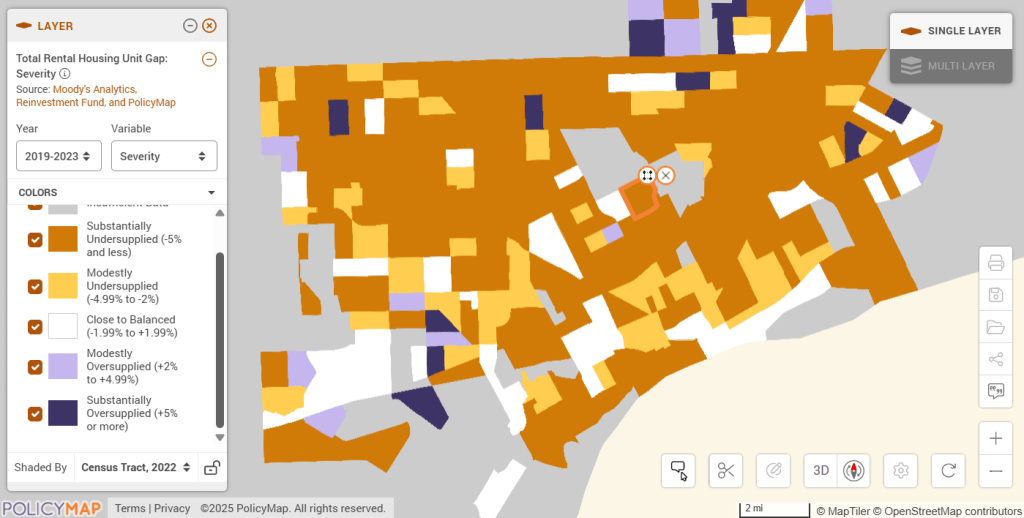 The total number of renter housing units below or above expectation is the difference between the current number of renter vacant units in a census tract and the expected number of renter vacant units in a “normal” market.