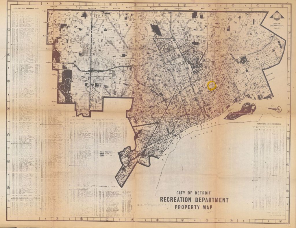 The map has some weathering and discoloration, but was clearly a map in active use from at least 1972 to 1976. What I love most about it is the active crossing out of property locations, like the “Seward 12th Playlot” and the active “Additions & Changes” including name changes, like “Seward-12th Playlot.” The map total the acres for the recreation Department at 5850 as of 1/72 (January 1972) and 5860 as of 1/76 (January 1976). There is a mystery highlighted circle at Mt. Elliott north of Gratiot. What was the Recreation Department planning in 1976?