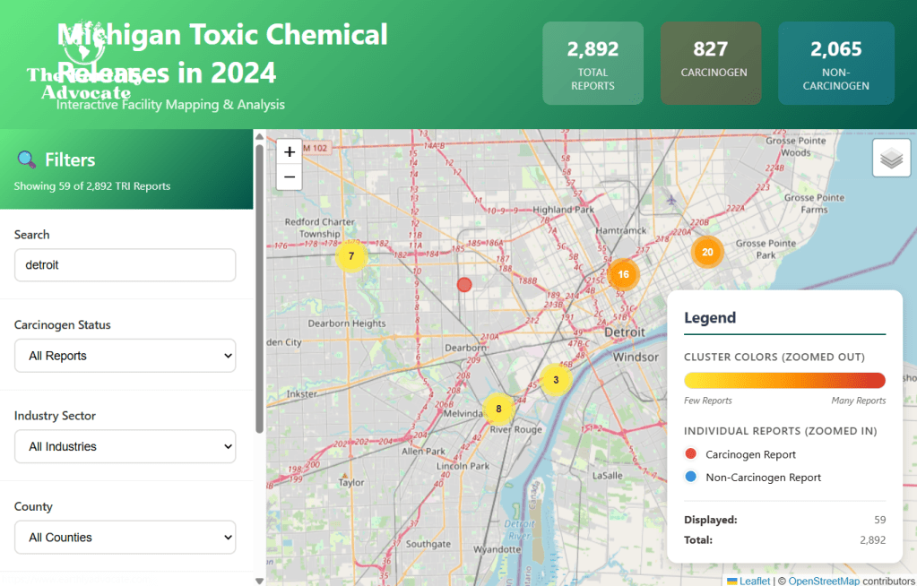 This map by The Earthly Advocate, Daja Elum, displays data from the Toxic Release Inventory (TRI) Program at the EPA, which has been under attack in recent years so I’m hoping the data is still reliable and maintained. The majority of toxic releases in Detroit came from the EQ Detroit (better known as US Ecology) facility near the former incinerator location and from the Stellantis Plant on the city’s Eastside.